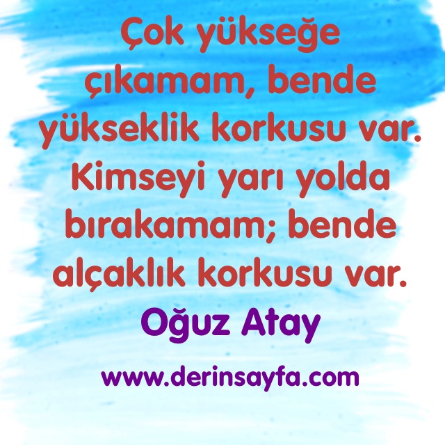 Çok yükseğe çıkamam, bende yükseklik korkusu var. Kimseyi yarı yolda bırakamam; bende alçaklık korkusu var. Oğuz Atay