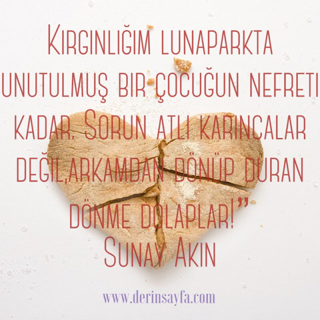 Kırgınlığım lunaparkta unutulmuş bir çocuğun nefreti kadar. Sorun atlı karıncalar değil,arkamdan dönüp duran dönme dolaplar! Sunay Akın