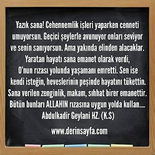 Rabbin ile aranda sen kendin varsın. Kendini aradan çıkar. İşte o zaman O’nu görürsün! ~ Abdülkadir Geylani (k.s.)