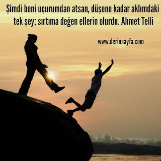 Şimdi beni uçurumdan atsan, düşene kadar aklımdaki tek şey; sırtıma değen ellerin olurdu. – Ahmet Telli