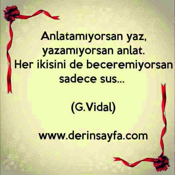 Anlatamıyorsan yaz, yazamıyorsan anlat. Her ikisini de beceremiyorsan sadece sus… (G.Vidal)