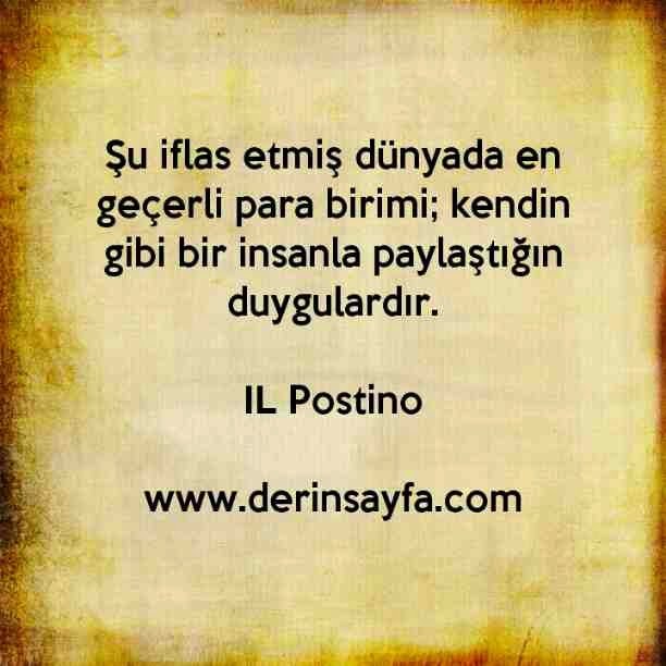 Şu iflas etmiş dünyada en geçerli para birimi; kendin gibi bir insanla paylaştığın duygulardır. – IL Postino