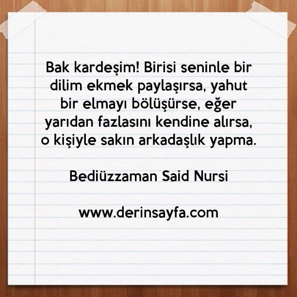 Bak kardeşim! Birisi seninle bir dilim ekmek paylaşırsa, yahut bir elmayı bölüşürse, eğer yarıdan fazlasını kendine alırsa, o kişiyle sakın