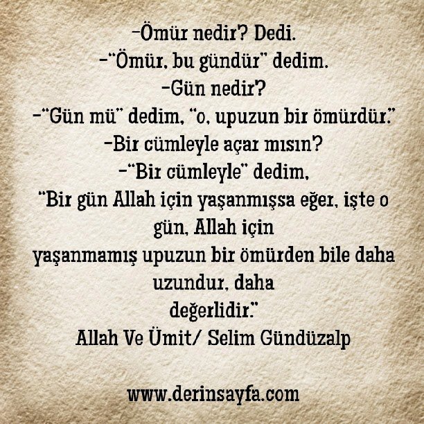 -Ömür nedir? Dedi. -“Ömür, bu gündür” dedim. -Gün nedir? -“Gün mü” dedim, “o, upuzun bir ömürdür.” -Bir cümleyle açar mısın?