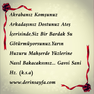 Akrabanız Komşunuz Arkadaşınız Dostunuz Ateş İçerisinde,Siz Bir Bardak Su Götürmüyorsunuz.Yarın Huzuru Mahşerde Yüzlerine Nasıl Bakacaksınız… Gavsi Sani Hz. (k.s.a)
