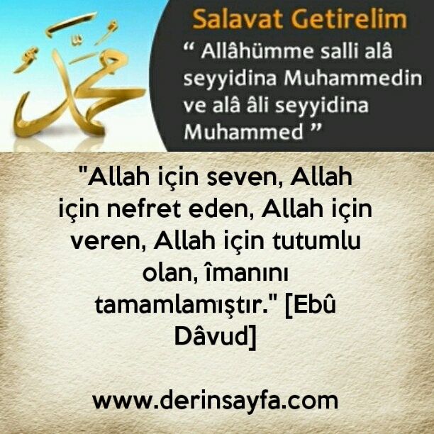 “Allah için seven, Allah için nefret eden, Allah için veren, Allah için tutumlu olan, îmanını tamamlamıştır.” [Ebû Dâvud]