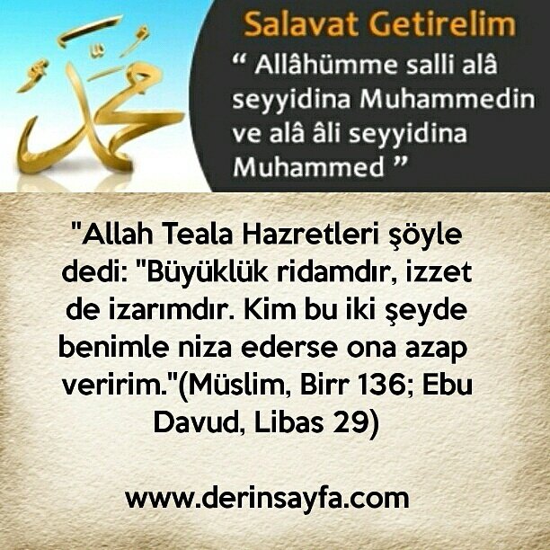 “Allah Teala Hazretleri şöyle dedi: “Büyüklük ridamdır, izzet de izarımdır. Kim bu iki şeyde benimle niza ederse ona azap veririm.”(Müslim,