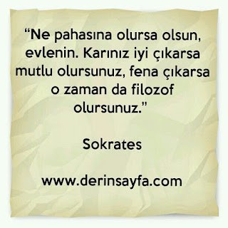 “Ne pahasına olursa olsun, evlenin. Karınız iyi çıkarsa mutlu olursunuz, fena çıkarsa o zaman da filozof olursunuz.” Sokrates