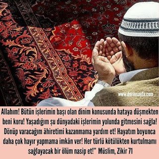 “Allâhümme aslih lî dînillezî hüve ısmetü emrî, ve aslih lî dünyâyelletî fîhâ meâşî, ve aslih lî âhiretilletî fîhâ meâdî, vec‘ali’l-hayâte