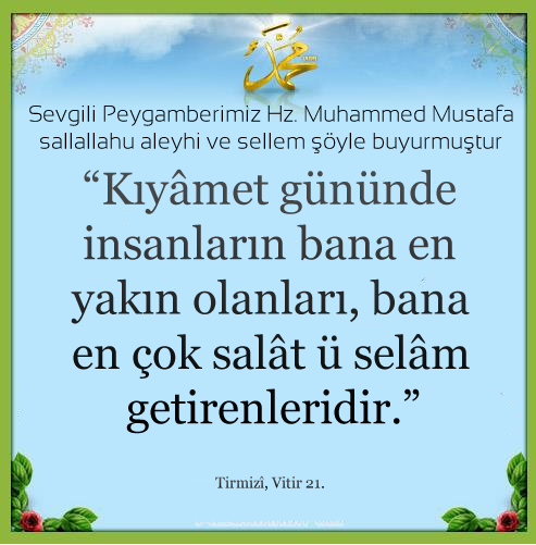 “Kıyâmet gününde insanların bana en yakın olanları, bana en çok salât ü selâm getirenleridir” (Tirmizî, Vitir 21.) Allâhümme salli alâ
