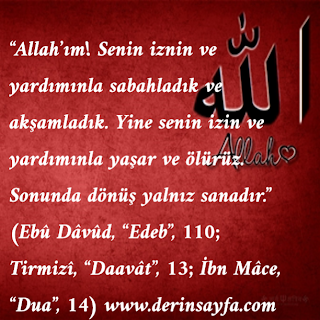 Sabah kalkarken-Akşam yatarken 1. اَللّٰهُمَّ بِكَ أَصْبَحْنَا وَبِكَ أَمْسَيْنَا وَبِكَ نَحْيَا وَبِكَ نَمُوتُ وَإِلَيْكَ اَلْمَص۪يرُ Allahümme bike esbahnâ ve bike