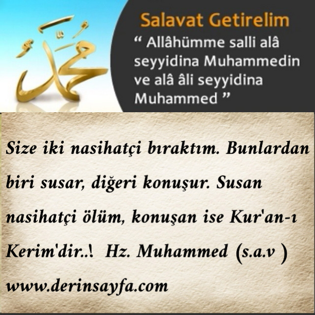 Size iki nasihatçi bıraktım. Bunlardan biri susar, diğeri konuşur. Susan nasihatçi ölüm, konuşan ise Kur’an-ı Kerim’dir..! ♥ Hz. Muhammed Mustafa