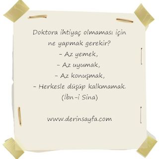 Doktora ihtiyaç olmaması için ne yapmak gerekir? – Az yemek, – Az uyumak, – Az konuşmak, – Herkesle düşüp kalkmamak. (İbn-i Sina)
