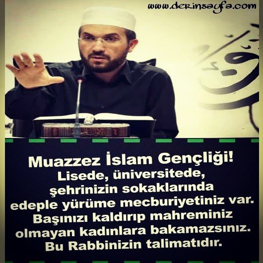 Muazzez İslam Gençliği! lisede, üniversitede, şehrimizi sokaklarında edeple yürüme mecburiyetiniz var. Başınızı kaldırıp mahreminiz olmayan kadınlara bakamazsınız. Bu Rab’binizin talimatıdır.