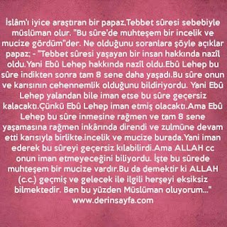 İslâm’ı iyice araştıran bir papaz,Tebbet sûresi sebebiyle müslüman olur. “Bu sûre’de muhteşem bir incelik ve mucize gördüm”der. Ne olduğunu soranlara