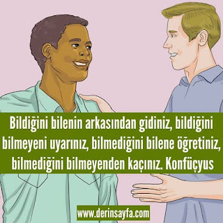 Bildiğini bilenin arkasından gidiniz, bildiğini bilmeyeni uyarınız, bilmediğini bilene öğretiniz, bilmediğini bilmeyenden kaçınız. Konfüçyus