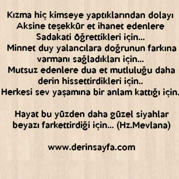 Kızma hiç kimseye yaptıklarından dolayı Aksine teşekkür et ihanet edenlere Sadakati öğrettikleri için… Minnet duy yalancılara doğrunun farkına varmanı sağladıkları