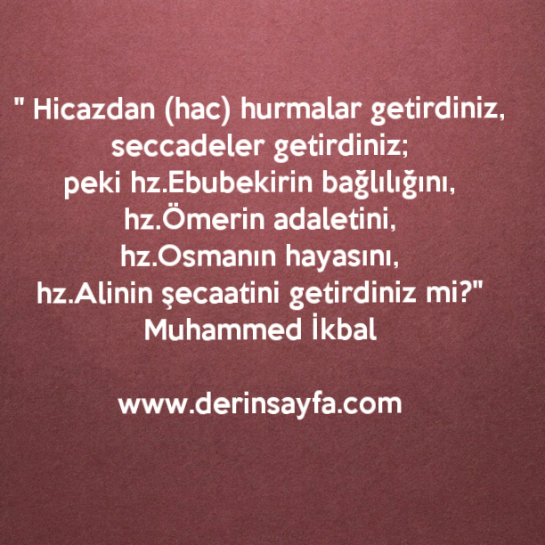 ” Hicazdan (hac) hurmalar getirdiniz, seccadeler getirdiniz; peki hz.Ebubekirin bağlılığını, hz.Ömerin adaletini, hz.Osmanın hayasını, hz.Alinin şecaatini getirdiniz mi?” Muhammed İkbal