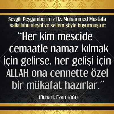 Sevgili Peygamberimiz Hz. Muhammed Mustafa sallallahu aleyhi ve sellem şöyle buyurmuştur: “Her kim mescide cemaatle namaz kılmak için gelirse, her