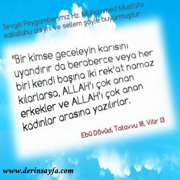 Sevgili Peygamberimiz Hz. Muhammed Mustafa sallallahu aleyhi ve sellem şöyle buyurmuştur: “Bir kimse geceleyin karısını uyandırır da beraberce veya her