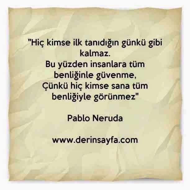 “Hayatta hiç bir zaman bir başkasına tüm benliğinle güvenme, çünkü; hiç kimse sana tüm benliğiyle görünmez.” – Pablo Neruda