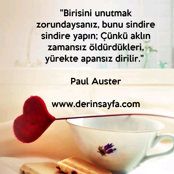 “Birisini unutmak zorundaysanız, bunu sindire sindire yapın; Çünkü aklın zamansız öldürdükleri, yürekte apansız dirilir.” – Paul Auster