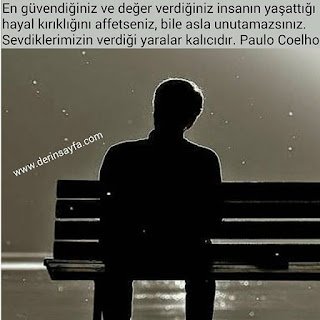 En güvendiğiniz ve değer verdiğiniz insanın yaşattığı hayal kırıklığını affetseniz, bile asla unutamazsınız. Sevdiklerimizin verdiği yaralar kalıcıdır. Paulo Coelho Giden