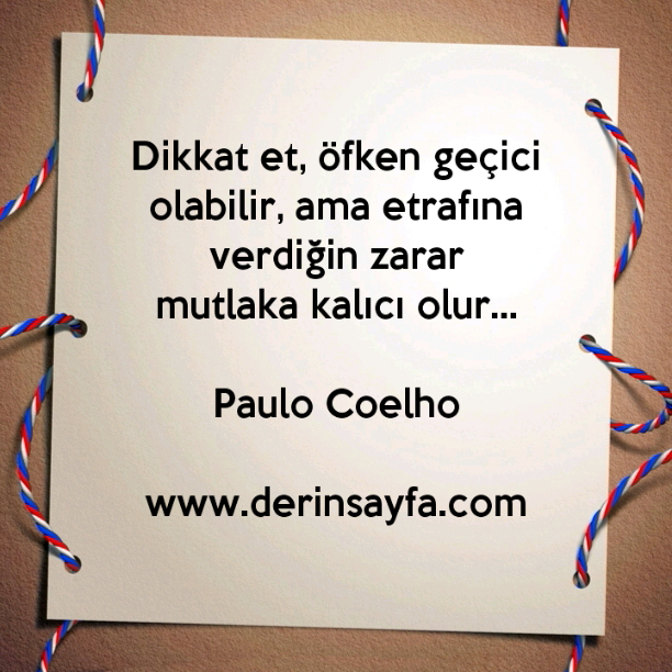 Dikkat et, öfken geçici olabilir, ama etrafına verdiğin zarar mutlaka kalıcı olur… Paulo Coelho