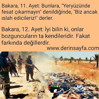 Bakara, 11. Ayet: Bunlara, “Yeryüzünde fesat çıkarmayın” denildiğinde, “Biz ancak ıslah edicileriz!” derler. Bakara, 12. Ayet: İyi bilin ki, onlar