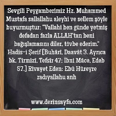 Sevgili Peygamberimiz Hz. Muhammed Mustafa sallallahu aleyhi ve sellem şöyle buyurmuştur: “Vallahi ben günde yetmiş defadan fazla ALLAH’tan beni bağışlamasını