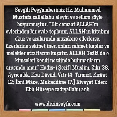 Sevgili Peygamberimiz Hz. Muhammed Mustafa sallallahu aleyhi ve sellem şöyle buyurmuştur: “Bir cemaat ALLAH’ın evlerinden bir evde toplanır, ALLAH’ın kitabını