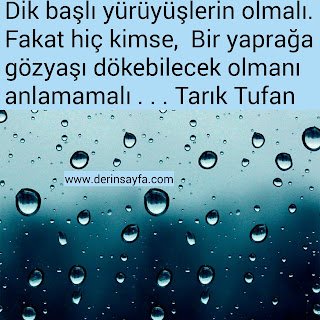 Dik başlı yürüyüşlerin olmalı. Fakat hiç kimse, Bir yaprağa gözyaşı dökebilecek olmanı anlamamalı . . . Tarık Tufan