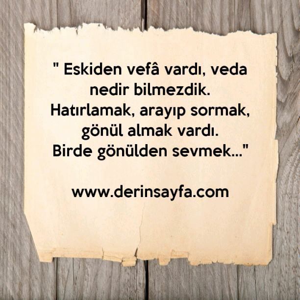 ” Eskiden vefâ vardı, veda nedir bilmezdik. Hatırlamak, arayıp sormak, gönül almak vardı. Birde gönülden sevmek…”