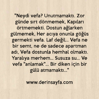 “Neydi vefa? Unutmamaktı. Zor günde sırt dönmemek, Kapıları örtmemekti. Dostun ağlarken gülmemek, Her acıya onunla göğüs germekti vefa. Laf değil…