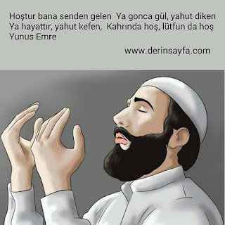 Hoştur bana senden gelen Ya gonca gül, yahut diken Ya hayattır, yahut kefen, Kahrında hoş, lütfun da hoş Yunus Emre