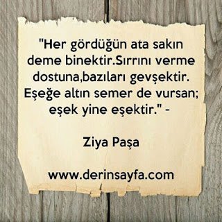 “Her gördüğün ata sakın deme binektir.Sırrını verme dostuna,bazıları gevşektir. Eşeğe altın semer de vursan; eşek yine eşektir.” – Ziya Paşa