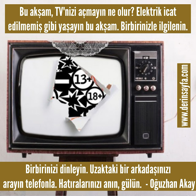 Bu akşam, TV’nizi açmayın ne olur? Elektrik icat edilmemiş gibi yaşayın bu akşam. Birbirinizle ilgilenin. Birbirinizi dinleyin. Uzaktaki bir arkadaşınızı
