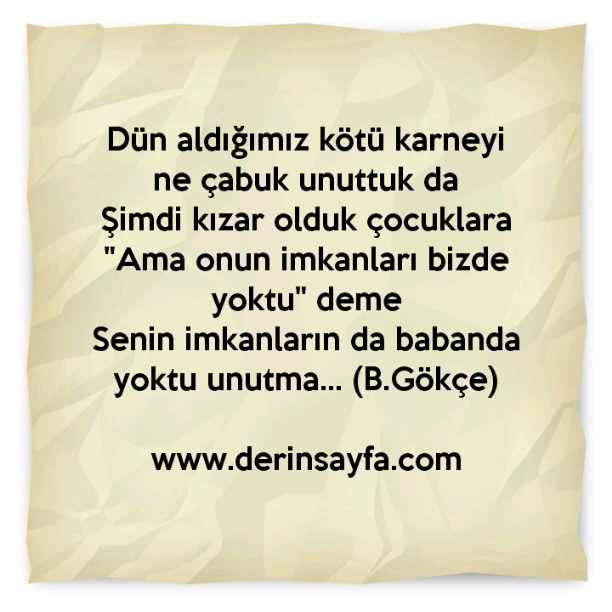 Dün aldığımız kötü karneyi ne çabuk unuttuk da Şimdi kızar olduk çocuklara "Ama onun imkanları bizde yoktu" deme. Bedirhan Gökçe