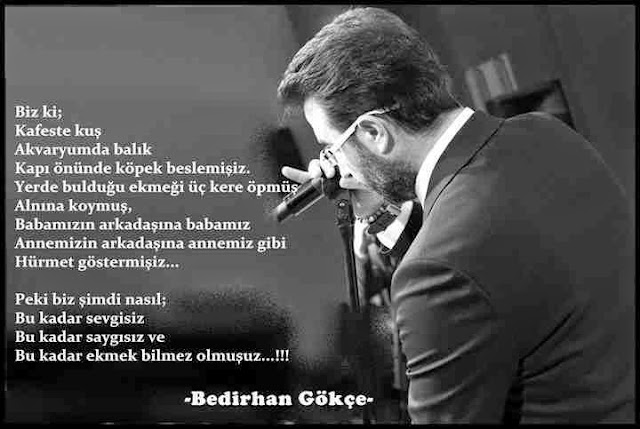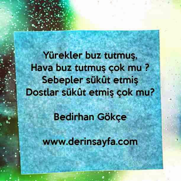 Yürekler buz tutmuş, Hava buz tutmuş çok mu ? Sebepler sükût etmiş Dostlar sükût etmiş çok mu? Bedirhan Gökçe