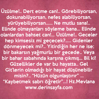 Üzülme!.. Dert etme can!.. Görebiliyorsan, dokunabiliyorsan, nefes alabiliyorsan, yürüyebiliyorsan…… Ne mutlu sana!.. Elinde olmayanları söyleme bana… Elinde olanlardan bahset can!…