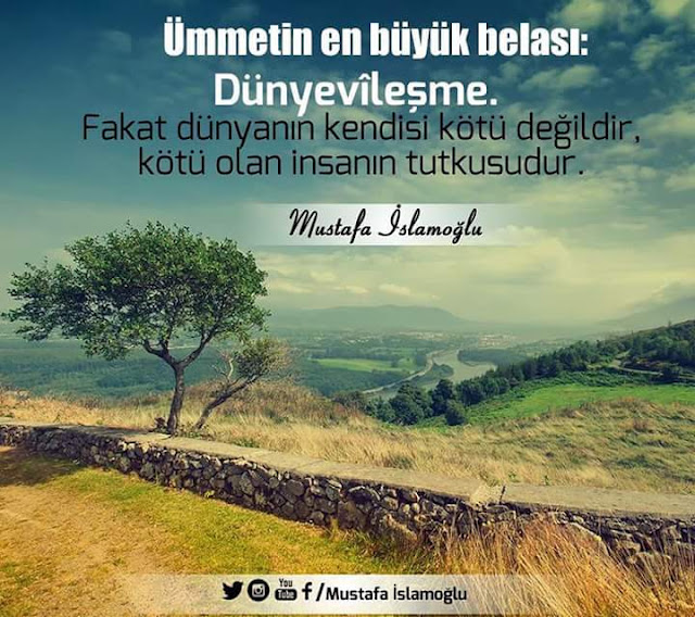 Ümmetin en büyük belası: Dünyevîleşme. Fakat dünyanın kendisi kötü değildir,kötü olan insanın tutkusudur. Mustafa İslamoğlu