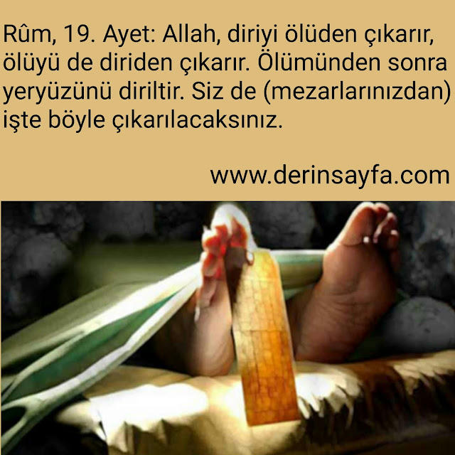 Rûm, 19. Ayet: Allah, diriyi ölüden çıkarır, ölüyü de diriden çıkarır. Ölümünden sonra yeryüzünü diriltir. Siz de (mezarlarınızdan) işte böyle