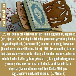 “Leş, kan, domuz eti, Allah’tan başkası adına boğazlanan, boğulmuş, (taş, ağaç vb. ile) vurulup öldürülmüş, yukarıdan yuvarlanıp ölmüş, boynuzlanıp ölmüş