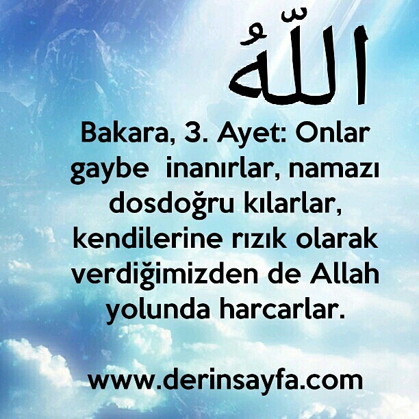 Bakara, 3. Ayet: Onlar gaybe inanırlar, namazı dosdoğru kılarlar, kendilerine rızık olarak verdiğimizden de Allah yolunda harcarlar.