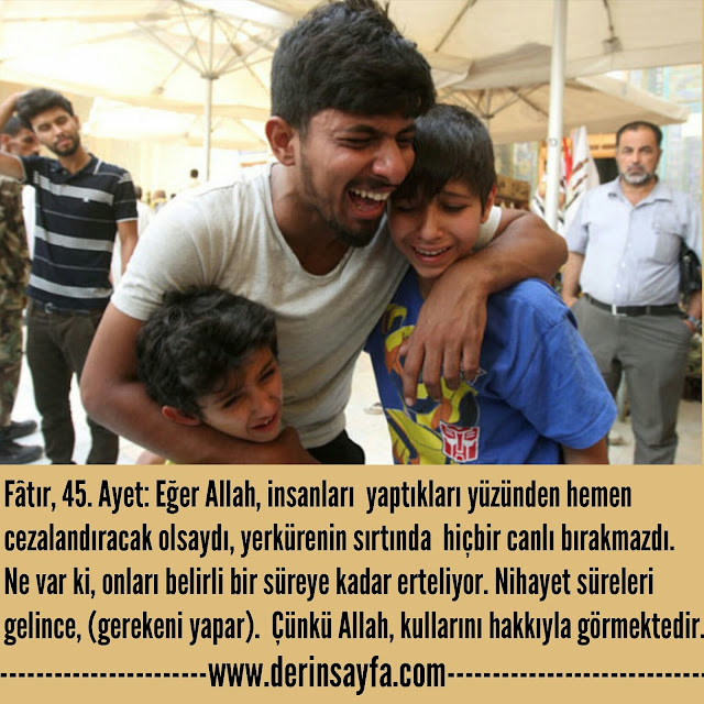 Fâtır, 45. Ayet: Eğer Allah, insanları kazandıkları yüzünden hemen cezalandıracak olsaydı, yerkürenin sırtında hiçbir canlı bırakmazdı. Ne var ki, onları
