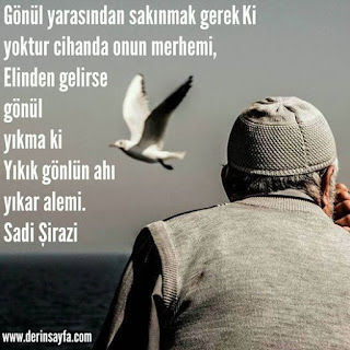 Gönül yarasından sakınmak gerek Ki yoktur cihanda onun merhemi, Elinden gelirse gönül yıkma ki Yıkık gönlün ahı yıkar alemi. Sadi